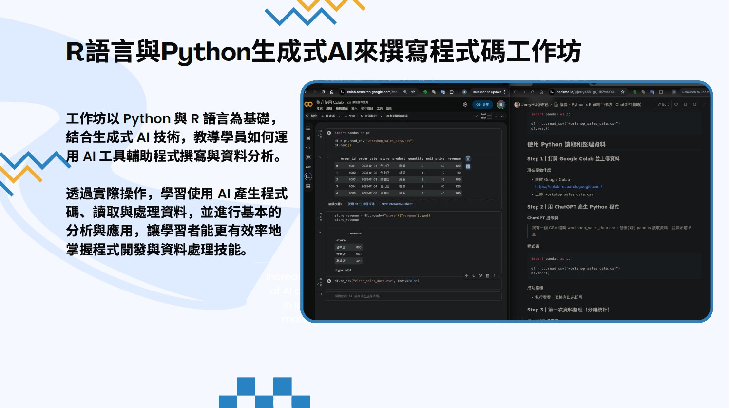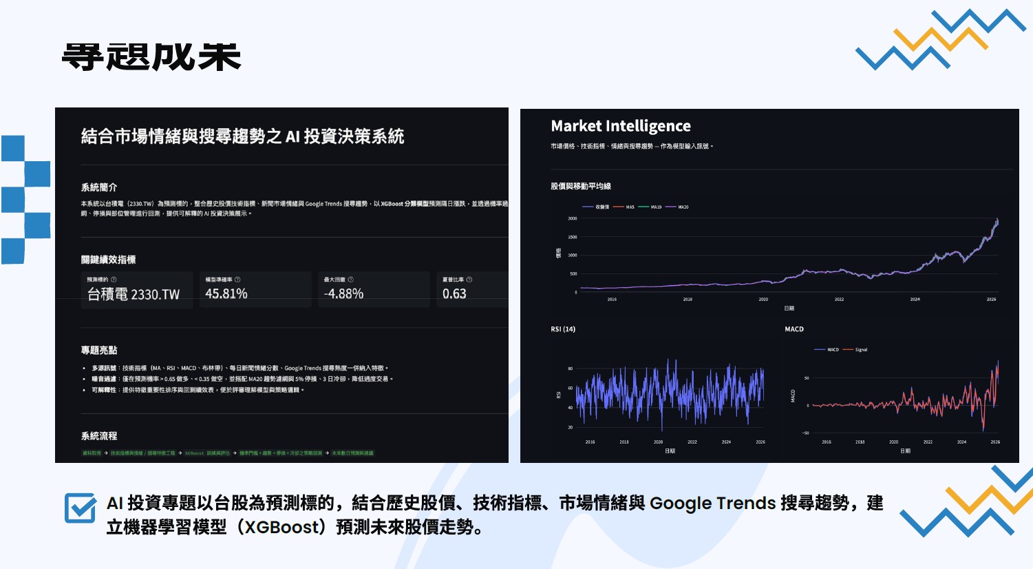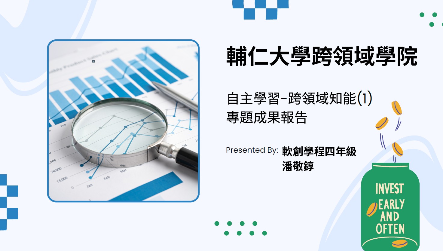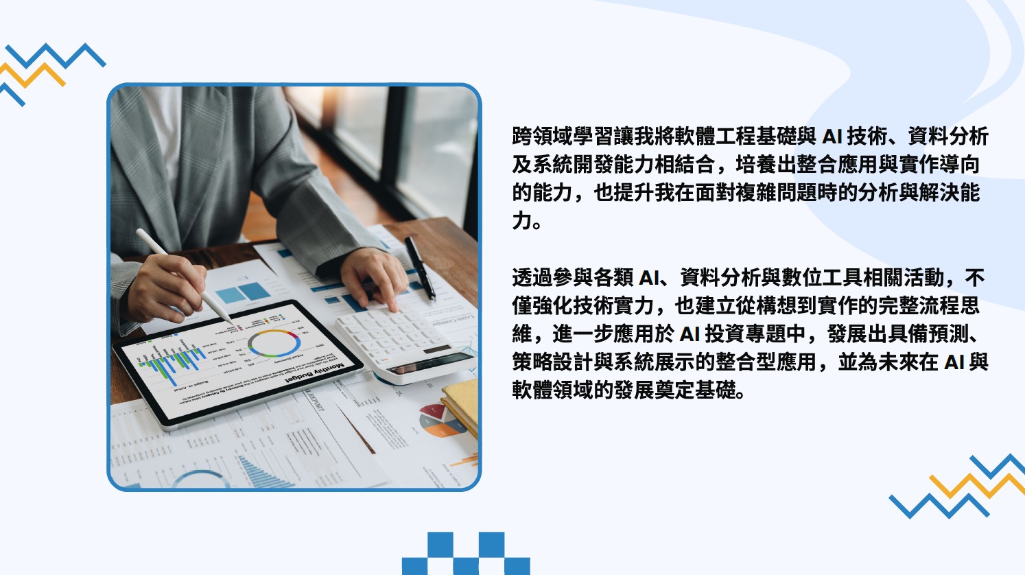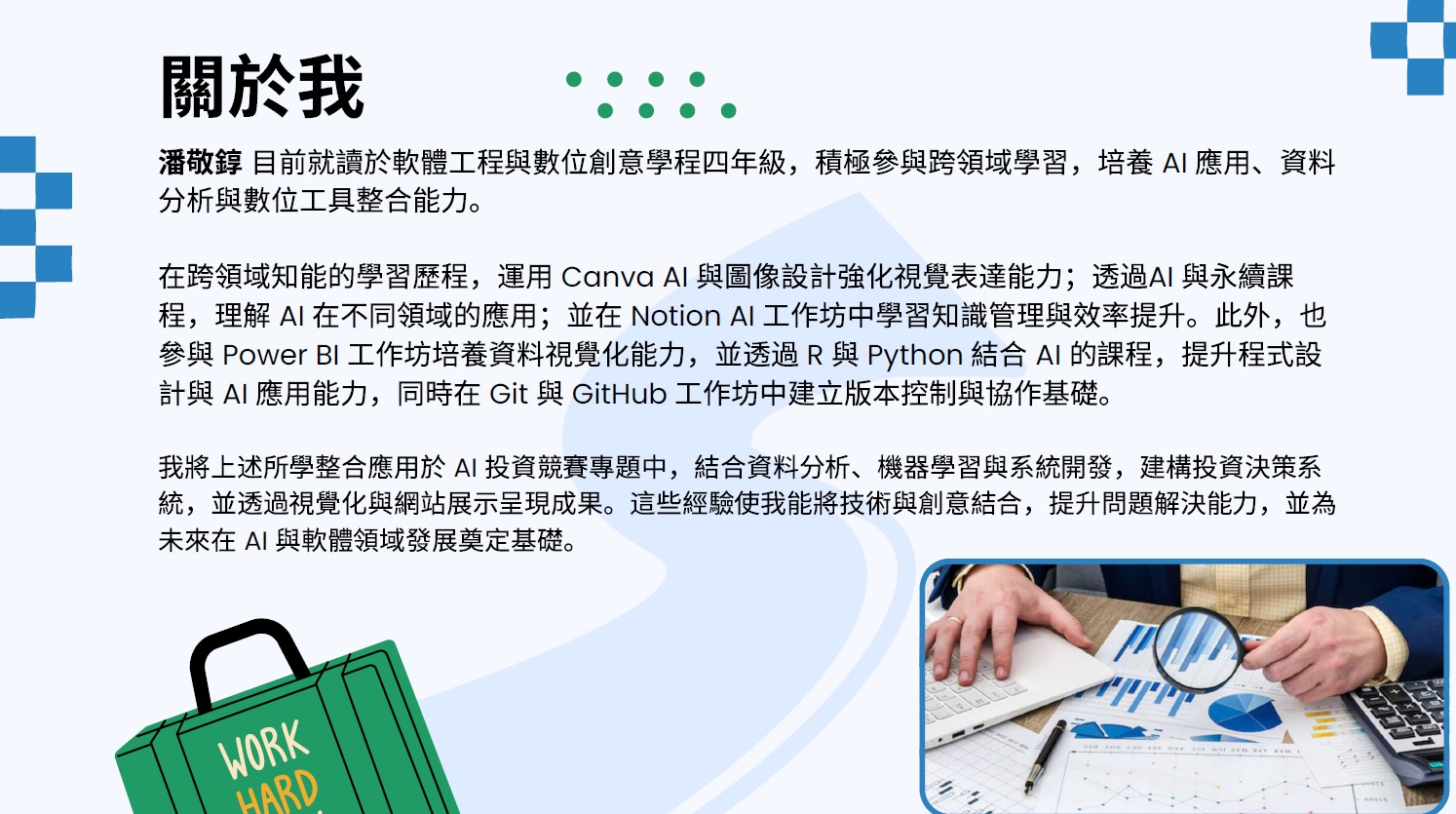 跨領域學習讓我將軟體工程基礎與 AI 技術、資料分析及系統開發能力相結合,培養出整合應用與實作導向的能力,也提升我在面對複雜問題時的分析與解決能力。透過參與各類 AI、資料分析與數位工具相關活動,不僅強化技術實力,也建立從構想到實作的完整流程思維,進一步應用於 AI 投資專題中,發展出具備預測、策略設計與系統展示的整合型應用,並為未來在 AI 與軟體領域的發展奠定基礎。